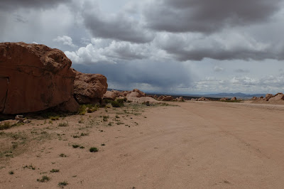Asfalt skonczyl sie w Chile. Jade po utwardzonym szuterku. Na horyzoncie pierwsze deszczowe kumulusy. Po 40 minutach zabiera mnie boliwijska rodzinka pracujaca w Chile. Przyjechali w swoje strony odpoczac. Zatrzymujemy sie w Valle de Roca. Senor wykopuje jakies warzywo w dolince i czestuje. "Niedojrzale, gorzkie, musi jeszcze troche w ziemii posiedziec" oznajmia.